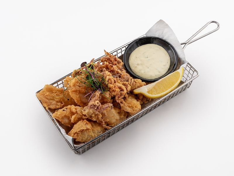 Deep-fried breaded shrimp, served with lemon wedges and tartar sauce
