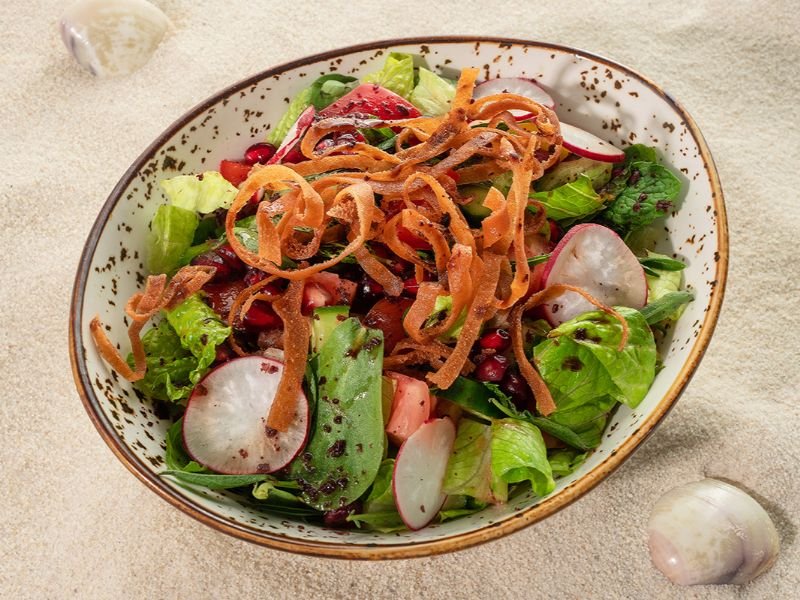 Tomato, Watercress, thyme, radish, onion, lettuce, mint, parsley, and crispy bread topped with pomegranates and sumac sauce