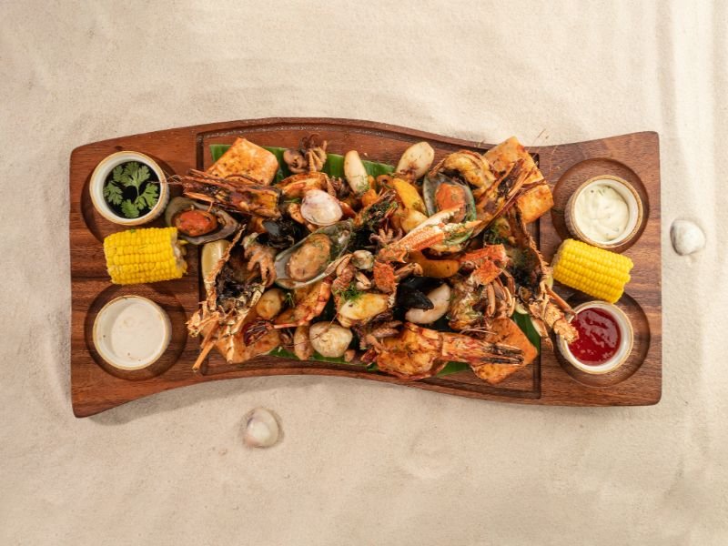 Grilled prawns, lobster, hamour, salmon, calamari, mussels, clams, fries spicy sauce, tartare sauce.