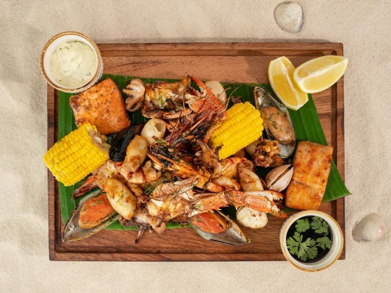 Grilled prawns, lobster, hamour, salmon, calamari, mussels, clams, fries spicy sauce, tartare sauce.