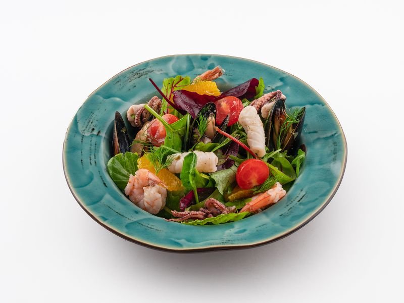Mix Marinated seafood, garlic lemon vinaigrette, cherry tomato, Capers, dill, mix lettuce