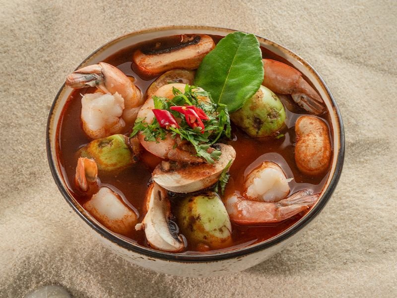Traditional hot and sour Thai soup, with shrimp, organic herbs, and mushrooms